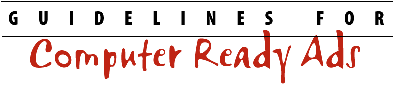 This will give an ad space of 27 x 44 picas (4-1/2" x 7-1/4"). If you are designing a half page or quarter page ad, merely divide the space appropriately. Designing the ad Then type the copy into your computer layout space. Make the type the font style and point size you desire. Most important is for you to have someone proofread your ad for you. We can make obvious typo changes in your file, but we may not proofread your ad. Suggestions for design. Use no more than two font styles, unless you have a good design reason for more. One good reason is for business names or logos. DO NOT set a script style in ALL CAPS. DO NOT set the whole ad in ALL CAPS. Please read the "File Formats" page for more information |
